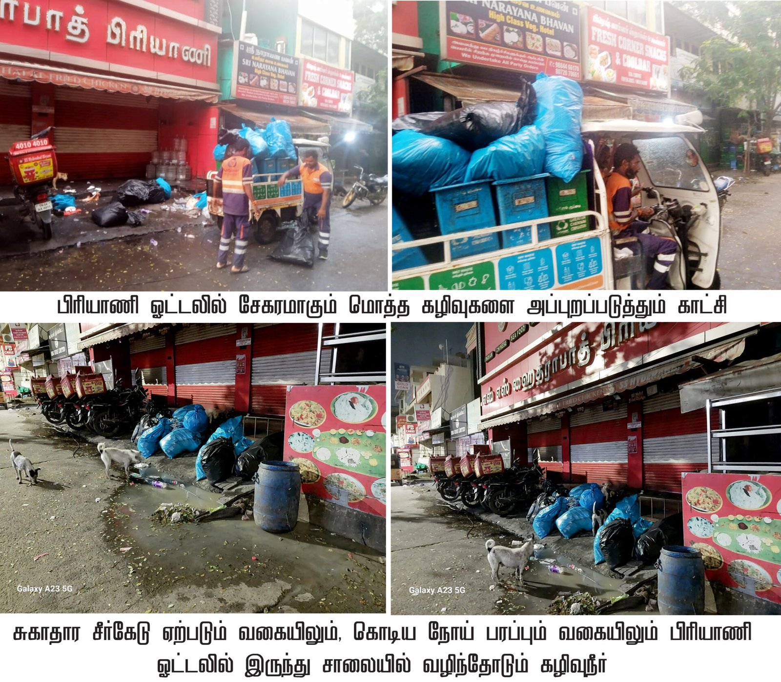 மேலும் இந்த பிரியாணி கடையின் கழிவுகளை சம்மந்தமே இல்லாத ஒப்பந்த ஊழியர்கள் அதிகாலையில் இரண்டு வாகனங்களில் வந்து அப்புறப்படுத்துகிறார்கள். கழிவுகளை அள்ள ஒப்பந்த அடிப்படையில் வாருவதற்கு செலுத்த வேண்டிய ஆயிரக்கணக்கான பணத்தை மிச்சப்படுத்தும் வகையில் இதுபோன்ற சாலைகளை சுத்தம் செய்யும் பணியாளர்களை கொண்டு வேலை வாங்கிக் கொள்கின்றனர். இதுபற்றி ஊழியர்களிடம் கேட்டால் தங்களுக்கு பிரியாணி கொடுப்பதாகவும், உதவி செய்வதாகவும் குறிப்பிடுகின்றனர்… இதேபோல் தனியார் விடுதிகள், மண்டபங்கள் உள்ளிட்டவற்றிலும் நடப்பதாகவும் குற்றச்சாட்டு எழுந்துள்ளது…