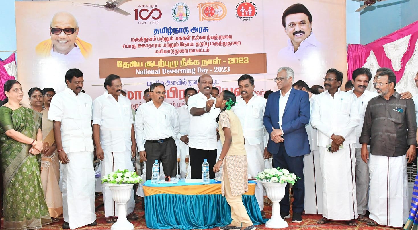 மயிலாடுதுறையில் கட்டப்பா நகராட்சி மேல்நிலைப் பள்ளியில் பொது சுகாதாரம் மற்றும் நோய் தடுப்பு மருந்துத்துறை சார்பில் தேசிய குடற்புழு நீக்க நாளினை முன்னிட்டு மாநில அளவில் பள்ளி மாணவ, மாணவிகளுக்கு குடற்புழு நீக்க மாத்திரைகள் வழங்குவதை மருத்துவம் மற்றும் மக்கள் நல்வாழ்வு துறை அமைச்சர் மா.சுப்பிரமணியன் தொடங்கி வைத்தார். உடன் மாவட்ட ஆட்சியர் ஏ.பி.மகாபாரதி, மயிலாடுதுறை நாடாளுமன்ற உறுப்பினர் செ.ராமலிங்கம், பூம்புகார் சட்டமன்ற உறுப்பினர் நிவேதா எம்.முருகன், மயிலாடுதுறை சட்டமன்ற உறுப்பினர் எஸ்.ராஜகுமார், சீர்காழி சட்டமன்ற உறுப்பினர் எம்.பன்னீர்செல்வம், பொது சுகாதாரம் மற்றும் நோய் தடுப்பு மருந்துத்துறை இயக்குனர் தி.சி.செல்வவிநாயகம், மாவட்ட ஊராட்சிக்குழு தலைவர் உமா மகேஸ்வரி சங்கர் ஆகியோர் உள்ளனர்.