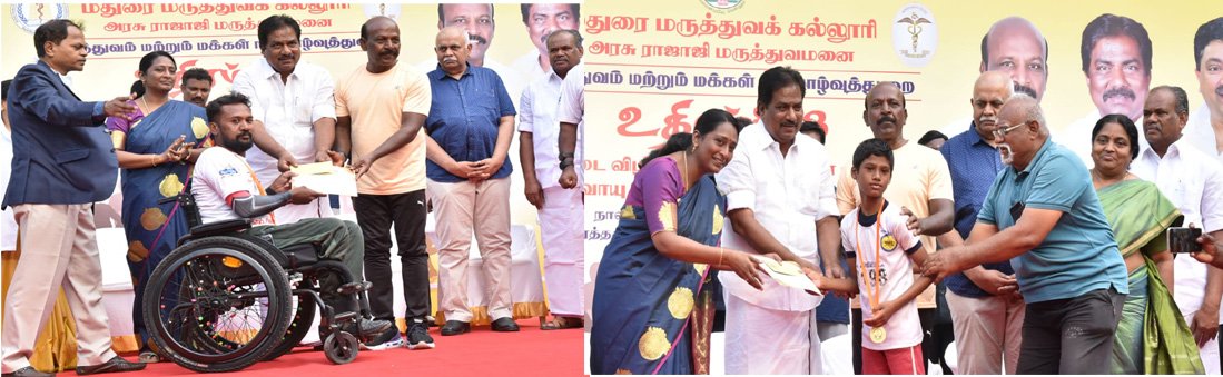 மதுரை அரசு ராஜாஜி மருத்துவக் கல்லூரி வளாகத்தில் மருத்துவம் மற்றும் மக்கள் நல்வாழ்வுத்துறை சார்பாக மருத்துவம் மற்றும் மக்கள் நல்வாழ்வுத்துறை அமைச்சர் மா.சுப்பிரமணியன், வணிகவரி மற்றும் பதிவு துறை அமைச்சர் பி.மூர்த்தி இன்று (23.07.2023) உதிரம்”23″ குருதிக்கொடை விழிப்புணர்வு மாரத்தான் ஓட்ட போட்டியில் பங்கேற்றவர்களுக்கான பாராட்டு சான்றிதழ்கள் வழங்கினாகள் உடன், மாவட்ட ஆட்சித் தலைவர் மா.செள.சங்கீதா, சட்டமன்ற உறுப்பினர் மு.பூமிநாதன் (மதுரை தெற்கு) ஆகியோர் உள்ளார்கள்.