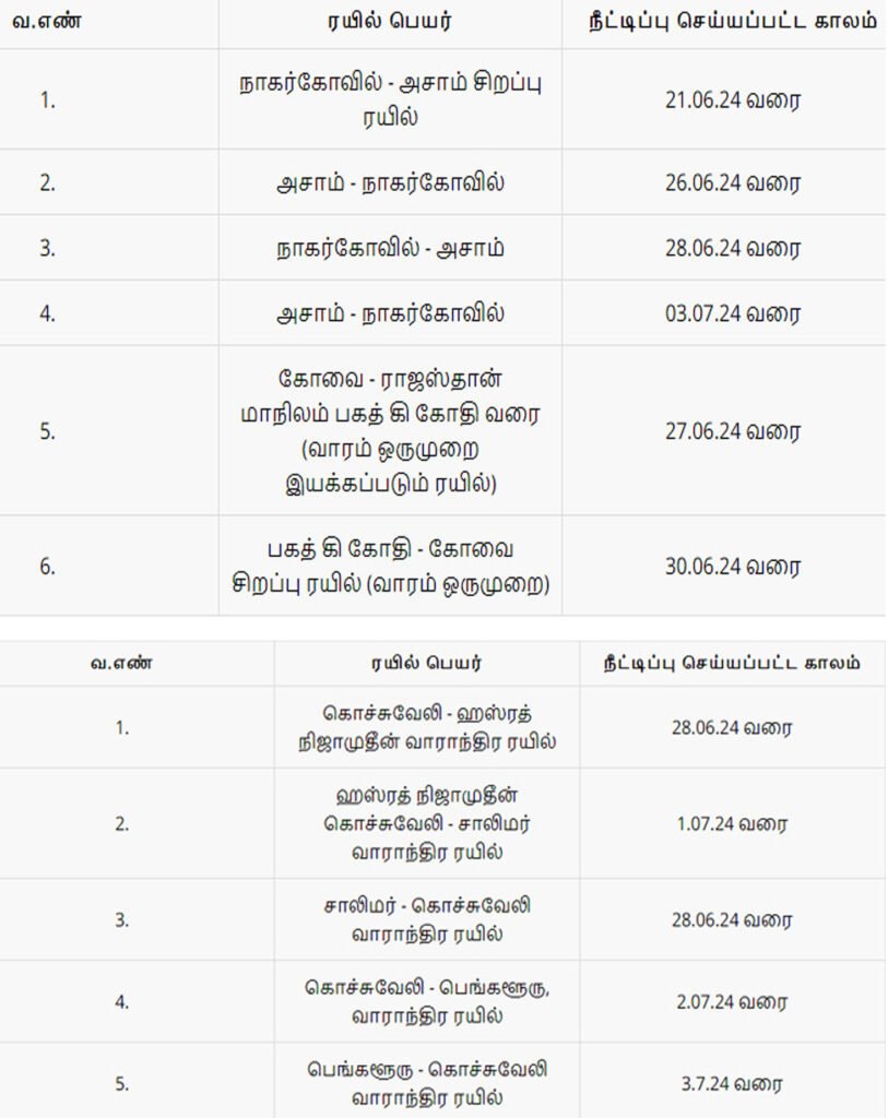 அதன்படி, நாகர்கோவில் – அசாம் சிறப்பு ரயில் 21.06.24 வரையும், அசாம் – நாகர்கோவில் 26.06.24 வரையும், நாகர்கோவில் – அசாம் 28.06.24 வரை, அசாம் – நாகர்கோவில் 03.07.24 வரை, கோவை – ராஜஸ்தான் மாநிலம் பகத் கி கோதி வரை (வாரம் ஒருமுறை இயக்கப்படும் ரயில்) 27.06.24 வரை, பகத் கி கோதி – கோவை சிறப்பு ரயில் (வாரம் ஒருமுறை