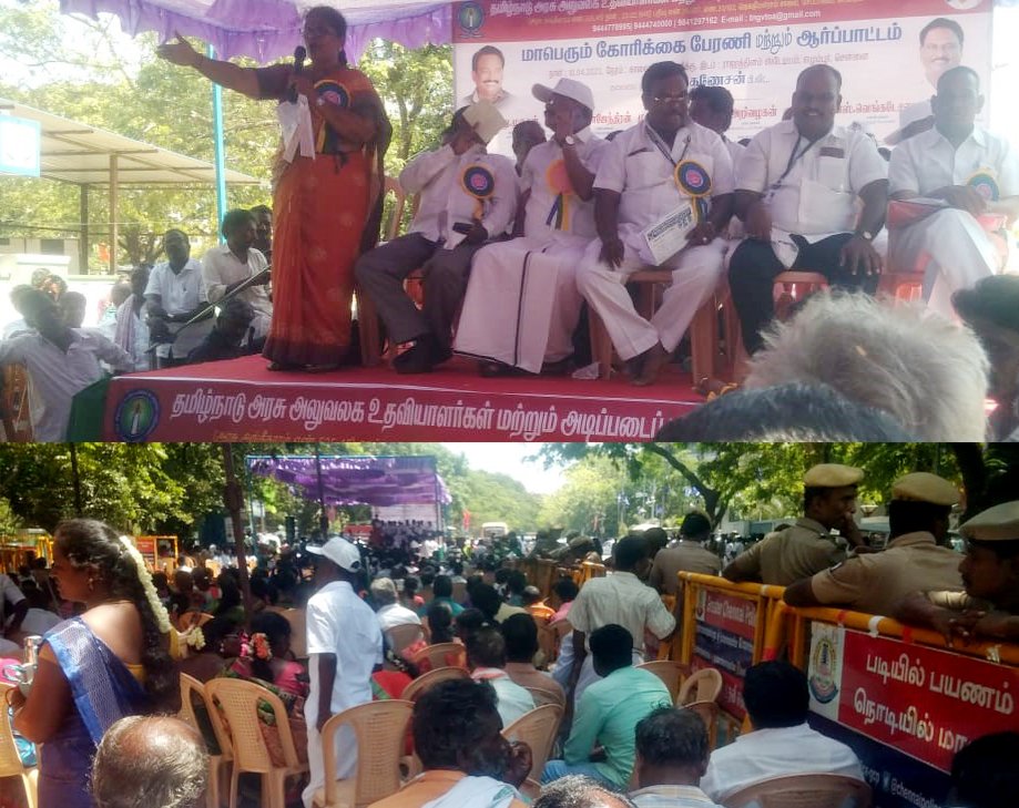 சென்னை சிந்தாதிரிப்பேட்டை ரவுண்டானா அருகே மாநில ஆணையம் தமிழ் நாடு அரசு அலுவலக ஒன்றியம் இரா.சண்முகராஜனால் துவங்கப்பட்ட பேரணி, எழும்பூர் ராஜரத்தினம் ஸ்டேடியம் அருகே முடிவடைந்தது.