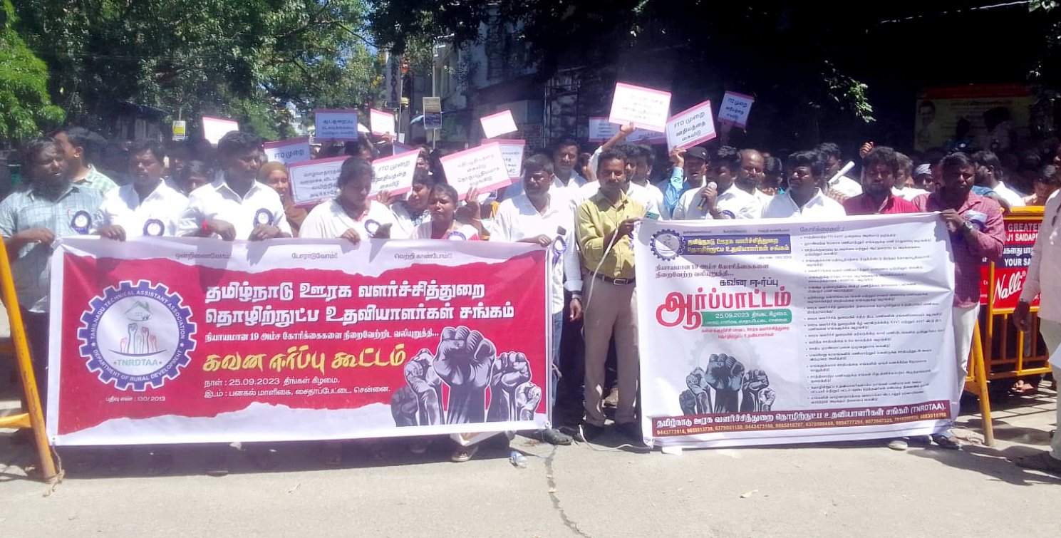 சென்னை சைதாப்பேட்டை கலைஞர் பொன்விழா வளைவு அருகே தமிழ்நாடு ஊரக வளர்ச்சித்துறை தொழிற்நுட்ப உதவியாளர்கள் சங்க கவன ஈர்ப்பு கூட்டம் மாநில செயலாளர த.சாமிநாதன¢ தலைமையில் நடைபெற்றது. இதில் புதுக்கோட்டை மாவட்ட தலைவர் செ.குணசேகரன், மாநில செயற்குழு ம.உதயகுமார் ஆகியோர் வரவேற்றனர். கூட்டத்திற்கு ர.சக்கரபாணி, மு.சங்கவி, மு.திலிபன், அ.முகிலன், சு.விஜயன், வேலுப்பிள்ளை, பதிஸ்வரன், நாச்சிமுத்து, ரா.சந்திரசேகர், த.குமார், க.செல்லதுரை, இ.இளஞ்சுடன், பா.இளம்பிறை உள்பட பலர் முன்னிலை வகித்தனர்.