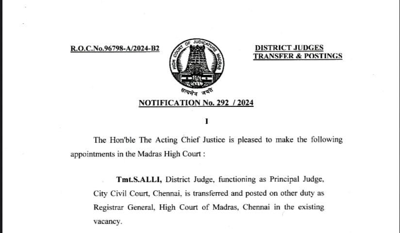 சென்னை உயர்நீதிமன்ற தலைமை பதிவாளராக நீதிபதி எஸ்.அல்லி நியமனம்.