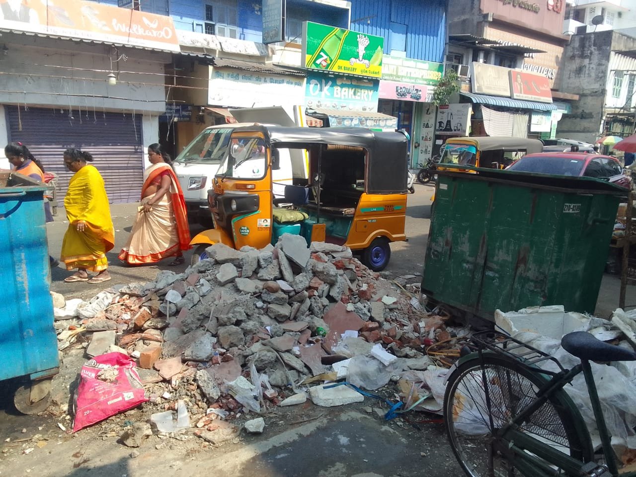 சென்னை சைதாப்பேட்டை ஜீனிஸ் ரோட்டில் உள்ள மீன் மார்கெட் புதுப்பிக்கப்பட்டு வருவதால் அதன் கட்டட துகள்களை ரோட்டில் கொட்டி வைக்கப்படுகிறது. மாதக் கணக்கில் அந்த கட்டட துகள்கள் அகற்றப்படாமல் உள்ளதால் அப்பகுதியில் போக்குவரத்து நெரிசல் அதிகம் காணப்படுகிறது. மக்கள், வாகன ஓட்டிகள் அதிக சிரமத்திற்கு உள்ளாகின்றனர். மாநகராட்சி விரைந்து நடவடிக்கை எடுக்க வேண்டும் என்று அப்பகுதி மக்கள் கோரிக்கை வைக்கின்றனர்.