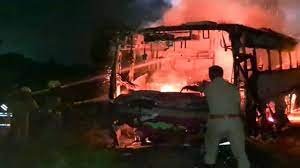 தெலங்கானா மாநிலம் ஐதராபாத்தில் இருந்து புதுச்சேரிக்கு நேற்றிரவு தனியார் சொகுசு பஸ் புறப்பட்டது. இந்த பஸ்சில் 25 பேர் பயணித்தனர். ஆந்திர மாநிலம் பிரகாசம் மாவட்டம் பித்ரகுண்டா தேசிய நெடுஞ்சாலை வழியாக இந்த பஸ் வந்துகொண்டிருந்தது. அப்போது, பஸ்சின் முன்பகுதியில் திடீரென குபுகுபுவென புகை வந்தது. இதனை கவனித்த டிரைவர் உடனடியாக பஸ்சை சாலையோரம் நிறுத்தி பயணிகளை உஷார்படுத்தினார். இதையடுத்து பஸ்சில் இருந்த அனைத்து பயணிகளும் அலறியடித்துகீழே இறங்கினர். பயணிகள் இறங்கிய சில நிமிடங்களில் பஸ் முழுவதும் தீப்பிடித்து கொழுந்துவிட்டு எரிந்தது.
