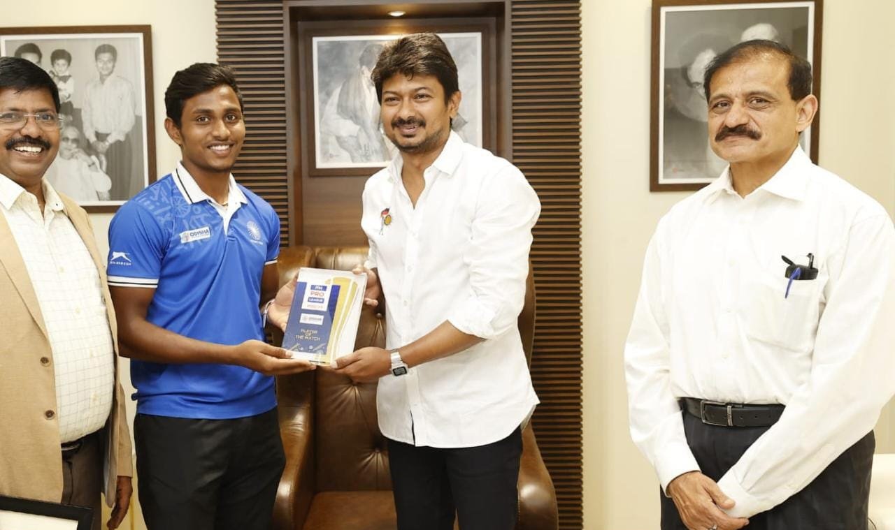 இளைஞர் நலன் மற்றும் விளையாட்டு மேம்பாட்டுத்துறை அமைச்சர் உதயநிதி ஸ்டாலின் சென்னை ஆழ்வார்பேட்டை முகாம் அலுவலகத்தில், அண்மையில் ஒடிசாவில் நடைபெற்ற எப்.ஐ.ஹெச். ஹாக்கி புரோ லீக் தொடரில் இந்தியா மற்றும் ஆஸ்திரேலியாவிற்கு இடையே நடைபெற்ற போட்டியில் 2 கோல்கள் அடித்து ஆட்ட நாயகனாக தேர்வான தமிழ்நாட்டைச் சேர்ந்த ஹாக்கி வீரர் கார்த்திக் சந்தித்து வாழ்த்து பெற்றார். இளைஞர் நலன் மற்றும் விளையாட்டு மேம்பாட்டுத்துறை கூடுதல் தலைமைச் செயலாளர் முனைவர் அதுல்ய மிஸ்ரா, தமிழ்நாடு விளையாட்டு மேம்பாட்டு ஆணைய பொது மேலாளர் மணிகண்டன், தமிழ்நாடு ஹாக்கி சங்க பொருளாளர் சேகர்.மனோகரன் உடனிருந்தனர்.