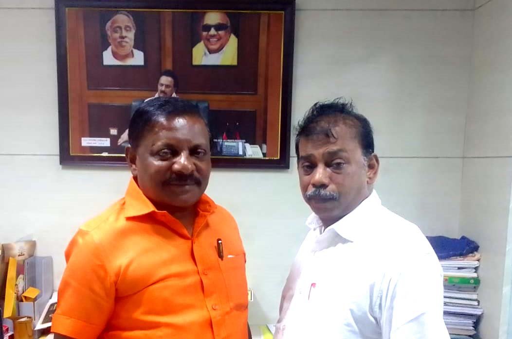 அண்ணா அறிவாலயத்தில் இன்று திரு அன்பகம் கலை (அமைப்பு துணைச் செயலாளர், தி.மு.க.) அவர்களை அவருடை அலுவலகத்தில் காலை 11.00 மணியளவில் திரு. மார்கெட் தேவராஜி அவர்கள் மரியாதை நிமித்தமாக சந்தித்த போது எடுத்த புகைப்படம்.