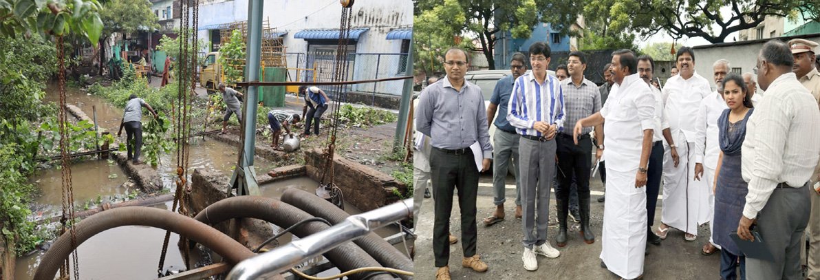 இன்று நகராட்சி நிருவாகத் துறை அமைச்சர் கே. என். நேரு, இந்து சமயம் மற்றும் அறநிலையத்துறை அமைச்சர் பி.கே.சேகர்பாபு, வடகிழக்குப் பருவமழையினை முன்னிட்டு பெருநகர சென்னை மாநகராட்சி திரு.வி.க.நகர் மண்டலம் டிமலஸ் சாலையில் உள்ள கால்வாயில் நீர் வெளியேற்றும் நிலையத்தினை பார்வையிட்டு ஆய்வு மேற்கொண்டார். இந்த ஆய்வின்போது மேயர் ஆர்.பிரியா, வி.க.நகர் சட்டமன்ற உறுப்பினர் தாயகம் கவி, துணை மேயர் மு.மகேஷ்குமார், கூடுதல் தலைமைச் செயலாளர்/ஆணையாளர் ஜெ.ராதாகிருஷ்ணன், சென்னை குடிநீர் வாரிய மேலாண்மை இயக்குநர் டி.ஜி.வினய், மத்திய வட்டார துணை ஆணையர் கே.ஜே.பிரவீன் குமார், மற்றும் அலுவலர்கள் உடனிருந்தனர்.