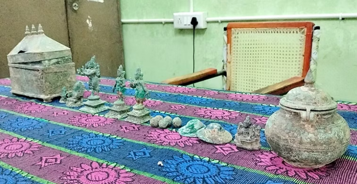 பதறிபோன அவர், சிறிய வடிவிலான உலோகப்பெட்டி புதைந்து இருந்ததை கண்டார். அதை திறந்து பார்த்தபோது பழமையான பெருமாள் சிலை ஒன்று, ஆண்டாள் சிலை இரண்டு, கருடன் சிலை ஒன்று, தெய்வ சிலை ஒன்று, உலோகத்தால் ஆன ருத்ராட்சம் ஐந்து, மூடியுடன் கூடிய சொம்பு, மகாலட்சுமி சிலை மற்றும் வட்ட வடிவில் தாளம் 2 போன்றவை இருந்துள்ளது.