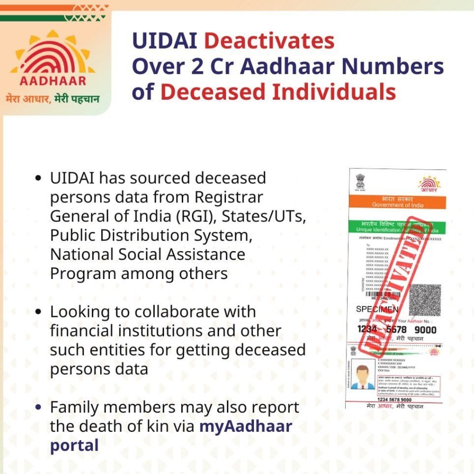 நாடு முழுவதும் 2 கோடிக்கும் மேற்பட்ட உயிரிழந்தவர்களின் ஆதார் எண்களை இந்திய தனித்துவ அடையாள ஆணையம் (UIDAI) நீக்கியுள்ளது