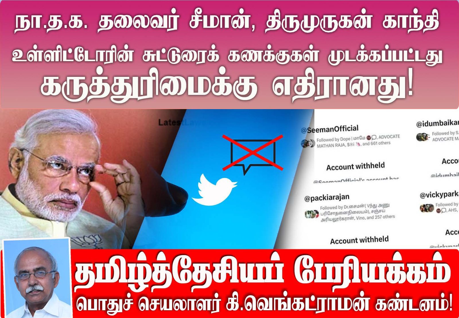 நாம் தமிழர் கட்சித் தலைமை ஒருங்கிணைப்பாளர் தோழர் செந்தமிழன் சீமான், மே பதினேழு இயக்க ஒருங்கிணைப்பாளர் தோழர் திருமுருகன் காந்தி மற்றும் நா.த.க. முதன்மை நிர்வாகிகள் பாக்கியராசன், இடும்பாவனம் கார்த்திக், சுனந்தா உள்ளிட்ட 20க்கும் மேற்பட்டோரின் சுட்டுரை (ட்விட்டர்) கணக்குகள் முடக்கப்பட்டதை எதிர்த்து தமிழ் தேசிய பேரியக்கத்தின் பொதுச்செயலாளர் கி. வெங்கட்ராமன் கண்டனம் தெரிவித்துள்ளார்.