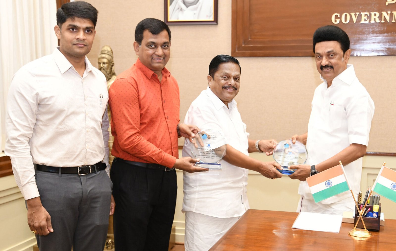தமிழ்நாடு முதலமைச்சர் மு.க.ஸ்டாலினை இன்று தலைமைச் செயலகத்தில் சுற்றுலாத்துறை அமைச்சர் கா.ராமச்சந்திரன் சந்தித்து, ஜெர்மன் நாட்டின் தலைநகர் பெர்லினில் பசிபிக் பகுதி பயண எழுத்தாளர்கள் சங்கத்தின் சார்பில் 8.3.2023 அன்று நடைபெற்ற பட்வா சர்வதேச பயண விருது வழங்கும் விழாவில் தமிழநாட்டின் சுற்றுலாத்துறைக்கு வழங்கப்பட்ட பாரம்பரிய சுற்றுலா இலக்கிற்கான விருது மற்றும் இந்தியாவில் சிறந்த சுற்றுலாத்துறை அமைச்சருக்காக தனக்கு வழங்கப்பட்ட விருது ஆகிய விருதுகளை காண்பித்து வாழ்த்து பெற்றார். உடன் சுற்றுலா, பண்பாடு மற்றும் அறநிலையங்கள் துறை முதன்மைச் செயலாளர் டாக்டர் பி.சந்திர மோகன், சுற்றுலாத்துறை இயக்குனர் சந்தீப் நந்தூரி ஆகியோர் உள்ளனர்.