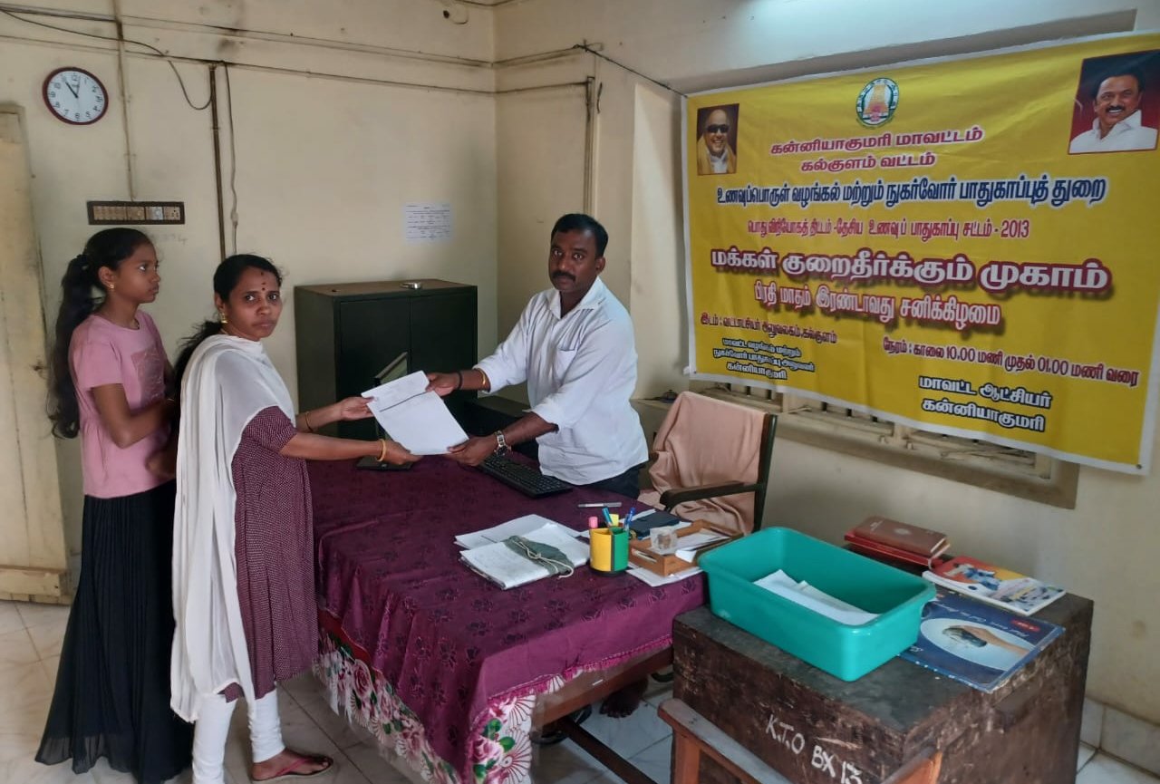 கன்னியாகுமரி மாவட்டம், கல்குளம் வட்டம் உணவு பொருள் வழங்கல் மற்றும் நுகர்வோர் பாதுகாப்பு துறை சார்பாக கல்குளம் வட்ட வழங்கல் அலுவலகத்தில் வைத்து வட்ட வழங்கல் அலுவலர் சுனில் குமார் அவர்கள் தலைமையில் பொது விநியோக திட்டம் மக்கள் குறை தீர்க்கும் முகாம் சனிக்கிழமை (25.01.2025) காலை 10.00 மணி முதல் பிற்பகல் 1.00 மணிவரை நடைபெற்றது. இந்த முகாமில் ஏராளமான பொதுமக்கள் கலந்து கொண்டு தங்கள் குடும்ப அட்டைகளில் உள்ள கோரிக்கைகளுக்கு உடனடியாக தீர்வு கண்டனர். குறிப்பாக குடும்ப அட்டைகளில் தொலைபேசி எண் பதிவேற்றம் செய்தல், பெயர் சேர்த்தல் மற்றும் நீக்குதல், முகவரி மாற்றம் செய்தல், இறந்து போன நபர்களின் பெயர்கள் நீக்கம் செய்து புகைப்படம் மாற்றம் செய்தல், குடும்ப அட்டைகளில் உள்ள பிழைகள் திருத்தம் செய்தல், குடும்ப தலைவர் மாற்றம் மற்றும் புகைப்படம் பதிவேற்றம் செய்தல், நகல் குடும்ப அட்டை வழங்குதல், நியாய விலை கடைக்கு நடந்து சென்று பொருட்கள் வாங்க முடியாத முதியவர்கள் மற்றும் மாற்றுதிறனாளிகள் மட்டும் உள்ள குடும்ப அட்டைகளுக்கு ரேசன் பொருட்கள் தடங்கல் இன்றி பெறும் வகையில் அங்கீகார சான்று வழங்குதல் உள்ளிட்ட பொதுமக்களின் பலவகையான கோரிக்கைகள் அனைத்திற்கும் ஒரே இடத்தில் உடனுக்குடன் தீர்வு காணப்பட்டது. மேலும் புதிய குடும்ப அட்டை கேட்டு விண்ணப்பித்துள்ளவர்களின் விண்ணப்பங்கள் மற்றும் குடும்ப அட்டை வகைப்பாடு மாற்றம் செய்து முன்னுரிமை குடும்ப அட்டை கோரிய விண்ணப்பங்கள் அனைத்தும் கள விசாரணைக்கு வட்ட வழங்கல் அலுவலரால் பரிந்துரை செய்யப்பட்டது.மனுவின் மீது உடனடியாக நடவடிக்கை எடுத்த கல்குளம் வட்ட வழங்கல் அலுவலர் அவர்களை பொதுமக்கள் சமூக ஆர்வலர்கள் பாராட்டினார்கள்