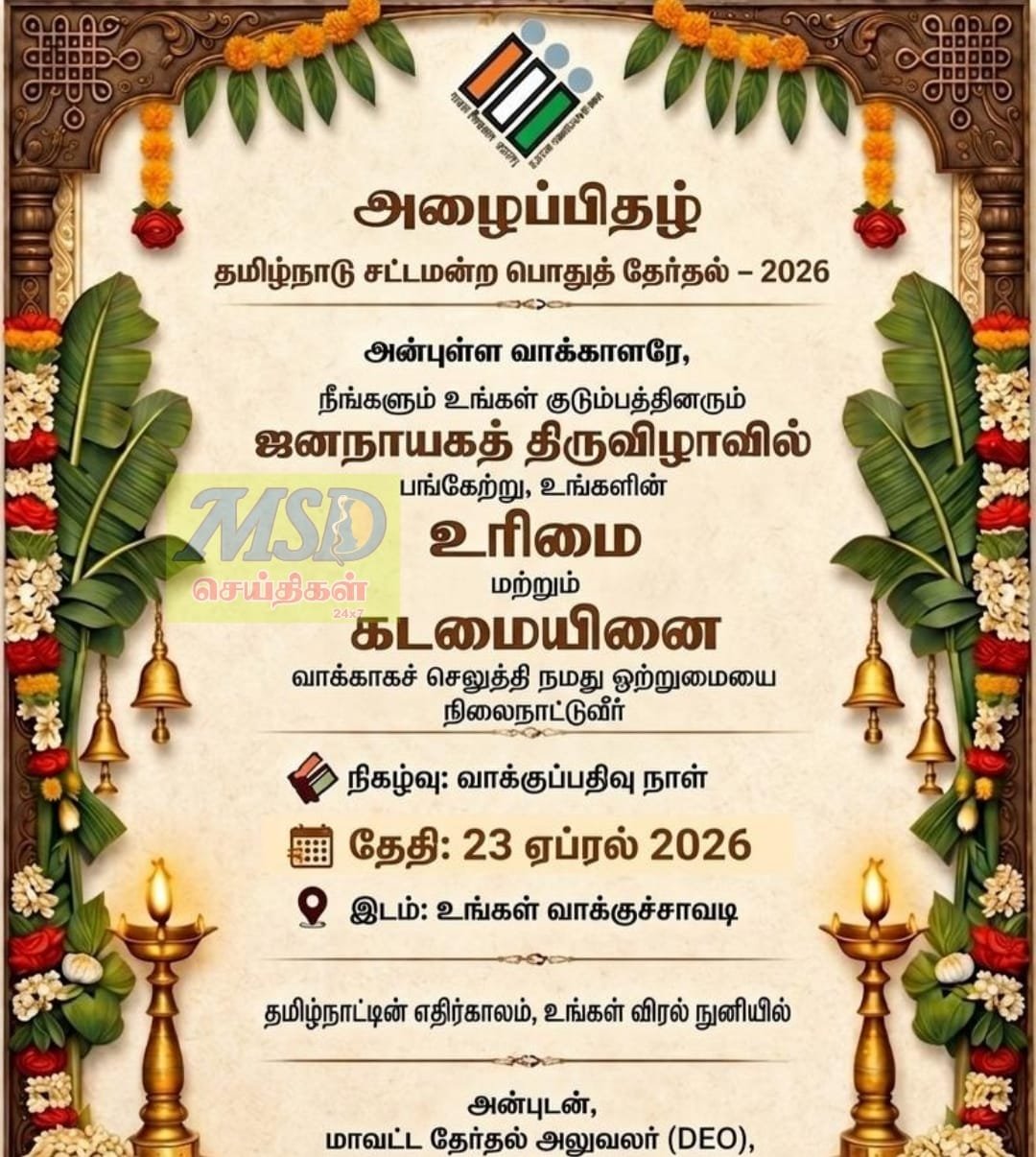 அன்புள்ள வாக்காளரே, நீங்களும் உங்கள் குடும்பத்தினரும் ஜனநாயகத் திருவிழாவில் பங்கேற்று, உங்களின் உரிமை மற்றும் கடமையினை வாக்காகச் செலுத்தி நமது ஒற்றுமையை நிலைநாட்டுவீர்