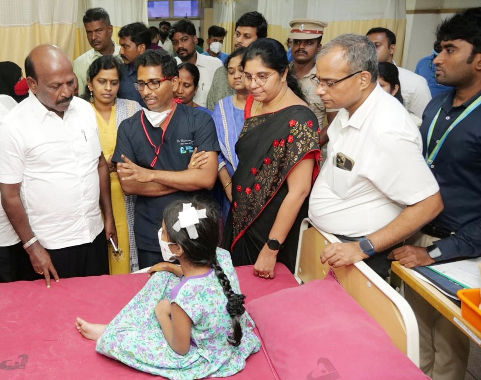 மருத்துவம் மற்றும் மக்கள் நல்வாழ்வுத்துறை அமைச்சர் மா.சுப்பிரமணியன் இன்று சென்னை அமைந்தகரை, பில்ரோத் மருத்துவமனையில், மாடுமுட்டி காயங்களுடன் சிகிச்சை பெற்று வந்த சிறுமி ஆயிஷா சித்திக் (வயது9) சந்தித்து நலம் விசாரித்து, அவர்களுக்கு அளிக்கப்படும் சிகிச்சைகள் குறித்து கேட்டறிந்தார். உடன் மருத்துவமனை உயர் மருத்துவர்கள்.