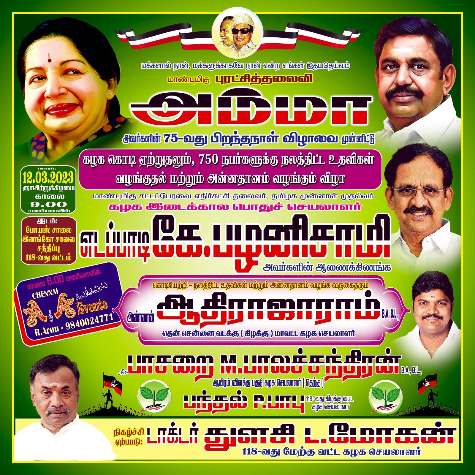 மறைந்த முன்னாள் முதல்வர் ஜெயலலிதாவின் 75வது பிறந்தநாளை முன்னிட்டு அதிமுக 118வது மேற்கு வட்ட அதிமுக செயலாளர் டாக்டர் துளசி எல்.மோகன் ஏற்பாட்டில் சென்னை போயஸ் சாலை இளங்கோ சாலை சந்திப்பில் 12ம் தேதி காலை 9 மணியளவில் 750 பேருக்கு நலத்திட்ட உதவிகள் வழங்கும் விழா நடக்கிறது. இதில் திரளான நிர்வாகிகள் பங்கேற்கின்றனர்.