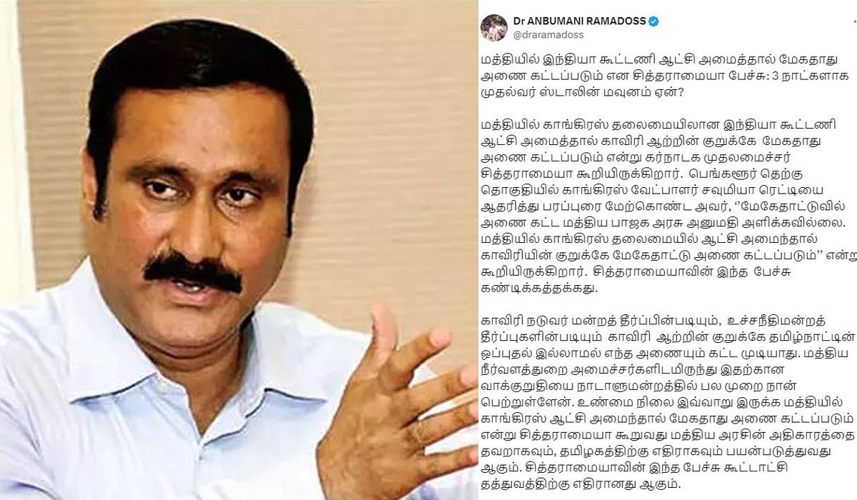 இதுதொடர்பாக பாமக தலைவர் அன்புமணி ராமதாஸ் தனது எக்ஸ் சமூகவலைத்தள பக்கத்தில் வெளியிட்டுள்ள பதிவில், மத்தியில் காங்கிரஸ் தலைமையிலான இந்தியா கூட்டணி ஆட்சி அமைத்தால் காவிரி ஆற்றின் குறுக்கே மேகதாது அணை கட்டப்படும் என்று கர்நாடக முதலமைச்சர் சித்தராமையா கூறியிருக்கிறார். பெங்களூர் தெற்கு தொகுதியில் காங்கிரஸ் வேட்பாளர் சவுமியா ரெட்டியை ஆதரித்து பரப்புரை மேற்கொண்ட அவர், ‘’மேகேதாட்டுவில் அணை கட்ட மத்திய பாஜக அரசு அனுமதி அளிக்கவில்லை. மத்தியில் காங்கிரஸ் தலைமையில் ஆட்சி அமைந்தால் காவிரியின் குறுக்கே மேகேதாட்டு அணை கட்டப்படும்’’ என்று கூறியிருக்கிறார். சித்தராமையாவின் இந்த பேச்சு கண்டிக்கத்தக்கது.