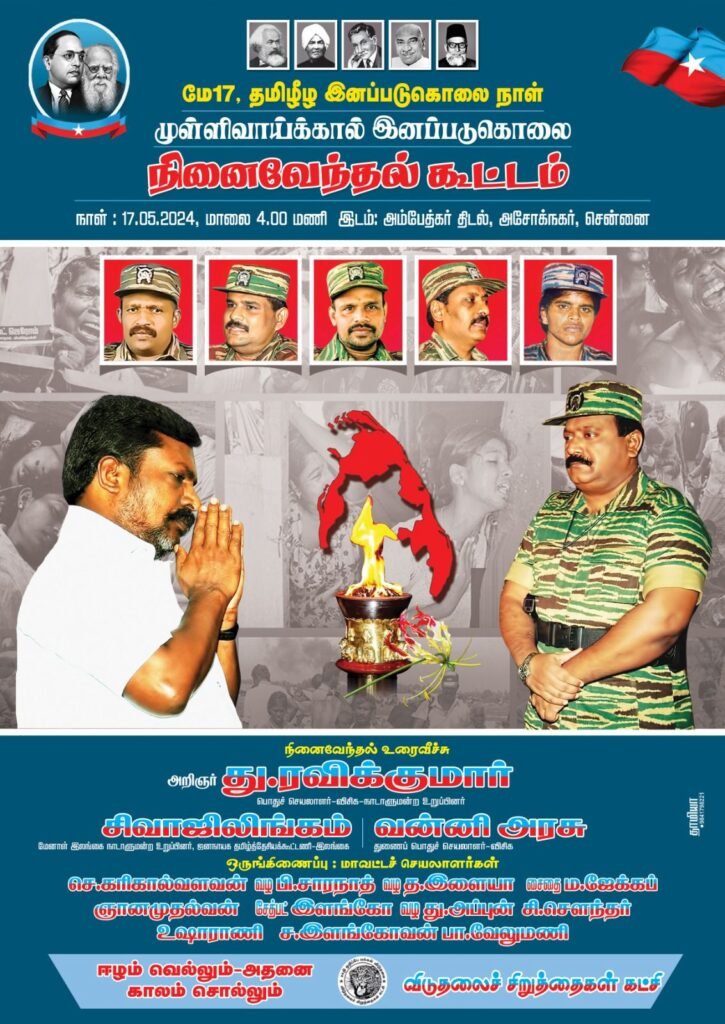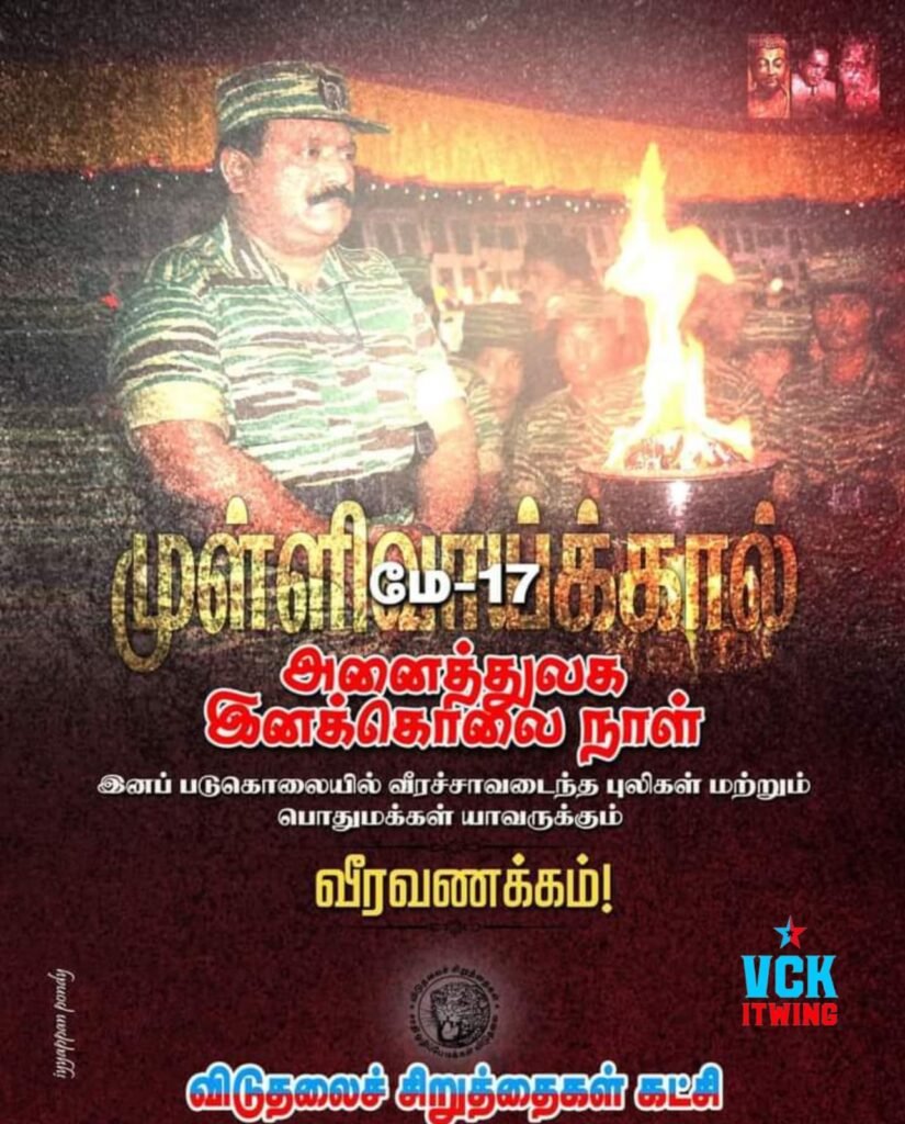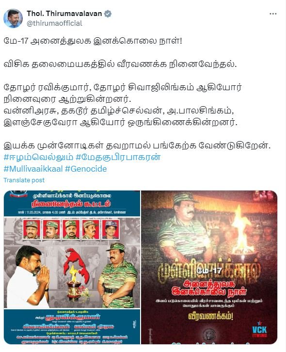 மே-17 அனைத்துலக இனக்கொலை நாள்! விசிக தலைமையகத்தில் வீரவணக்க நினைவேந்தல். தோழர் ரவிக்குமார், தோழர் சிவாஜிலிங்கம் ஆகியோர் நினைவுரை ஆற்றுகின்றனர். வன்னிஅரசு, தகடூர் தமிழ்ச்செல்வன், அ.பாலசிங்கம், இளஞ்சேகுவேரா ஆகியோர் ஒருங்கிணைக்கின்றனர். இயக்க முன்னோடிகள் தவறாமல் பங்கேற்க வேண்டுகிறேன். என விடுதலை சிறுத்தைகள் கட்சியின் தலைவர் திருமாவளவன் அவரின் டுவிட்டர் பக்கத்தில் பதிவிட்டுள்ளார்.