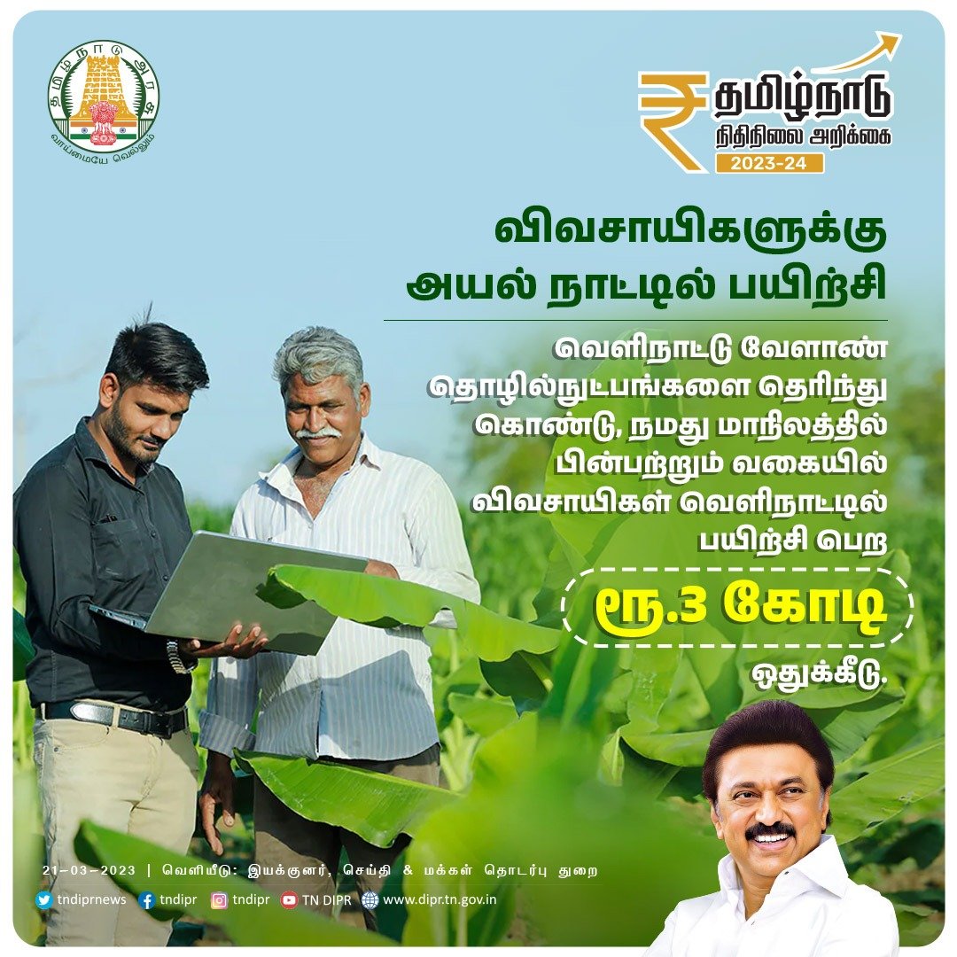 *வெளிநாட்டு தொழில்நுட்பங்களை அறிந்து கொண்டு தமிழ்நாட்டில் பின்பற்றும் வகையில், விவசாயிகள் வெளிநாட்டில் பயிற்சி பெற ரூ.3 கோடி நிதி ஒதுக்கீடு.