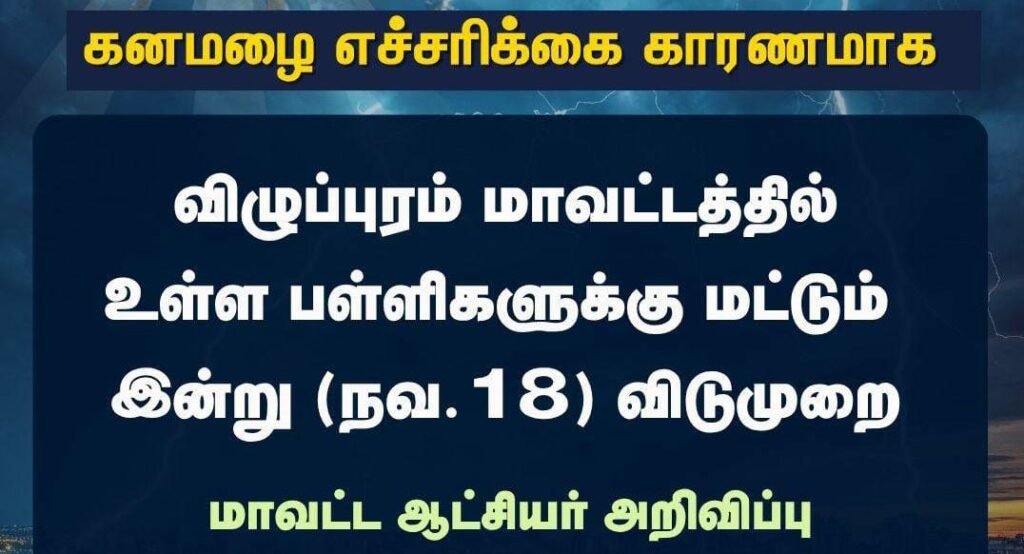 விழுப்புரம் மாவட்டத்தில் உள்ள பள்ளிகளுக்கு மட்டும் இன்று (நவ. 18) விடுமுறை
