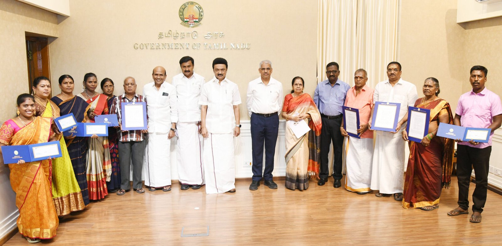 தமிழ்நாடு முதல்-அமைச்சர் மு.க.ஸ்டாலின் இன்று (29.9.2023) தலைமைச் செயலகத்தில், தமிழ்நாடு இயல் இசை நாடக மன்றத்தின் சார்பில் வறிய நிலையில் உள்ள 10 கலைமாமணி விருதாளர்களுக்கு பொற்கிழியாக தலா 1 லட்சம் ரூபாய்க்கான காசோலைகளை வழங்கிடும் அடையாளமாக 6 கலைமாமணி விருதாளர்களுக்கு பொற்கிழிக்கான காசோலைகளை வழங்கினார்.