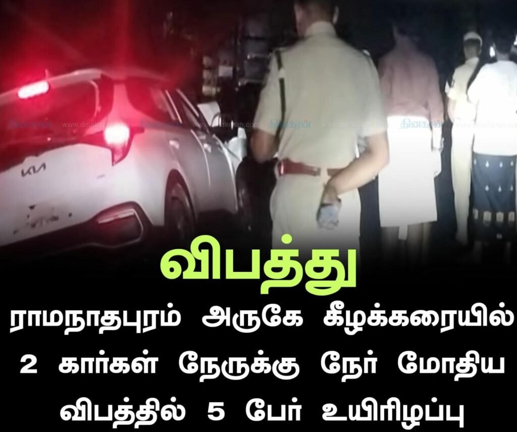 ராமநாதபுரம் அருகே கீழக்கரையில் 2 கார்கள் நேருக்கு நேர் மோதிய விபத்தில் 5 பேர் உயிரிழப்பு