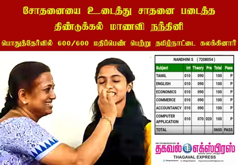 சோதனையை உடைத்து சாதனை படைத்த +2 வகுப்பு மாணவி நந்தினி: பொதுத்தேர்வி 600/600 மதிப்பெண்கள் பெற்றார் Read More » 08/05/2023