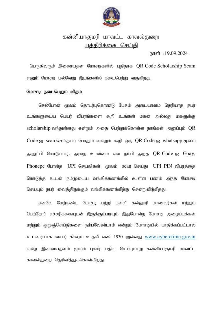 QR Code Scholarship Scam எனும் மோசடி…!கன்னியாகுமரி மாவட்ட காவல்துறையின் செய்தி… Read More » 21/09/2024