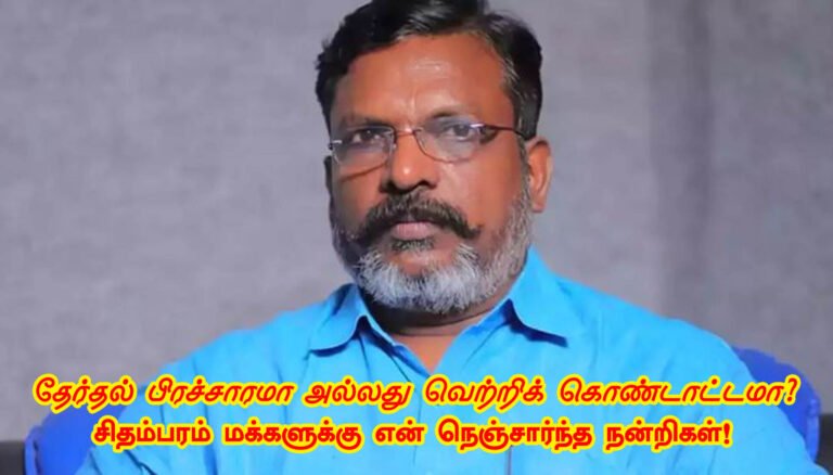 தேர்தல் பிரச்சாரமா ? வெற்றி கொண்டாட்டமா? : சிதம்பரம் மக்களுக்கு நன்றி… : தொல். திருமாவளவன் நெகிழ்ச்சி Read More » 11/04/2024