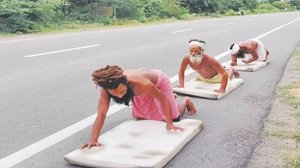 மத்திய பிரதேச மாநிலத்தில் கங்காப்பூர் என்ற இடத்தில் கோலோ கோதாம் ஆசிரமம் செயல்பட்டு வருகிறது. கொரோனா தாக்கத்திலிருந்து விடுபடவும் இது போன்ற கொடிய நோய் மீண்டும் உலகம் சந்திக்க கூடாது என்ற நோக்கத்திலும் ஆசிரமத்தில் உள்ள சீடர்கள் 3 பேர் சாலையில் ஊர்ந்தப்படி ராமேஸ்வரம் வரை முழங்காலின்