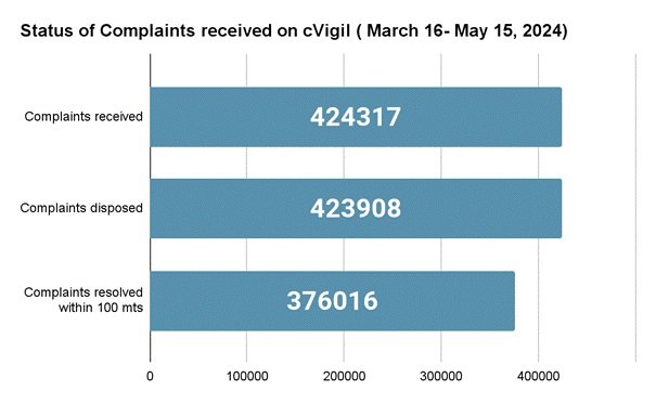 Within the Lok Sabha surveys 2024, the cVIGIL app of Race Commission of India has risen as a highly successful apparatus within the hands of individuals to hail race code infringement. Since the declaration of the Common Races 2024, over 4.24 lakh complaints have been gotten through this App as on May 15, 2024. Out of these 4,23,908 complaints have been arranged of and the remaining 409 cases are beneath handle. About, 89% complaints were settled inside a 100 minutes timeline, a guarantee by ECI, immovably held.
