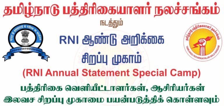 RNI ஆண்டறிக்கை சிறப்பு முகாம் நடைபெற உள்ளது : தமிழ்நாடு பத்திரிகையாளர் நலச்சங்கம்… Read More » 06/05/2023
